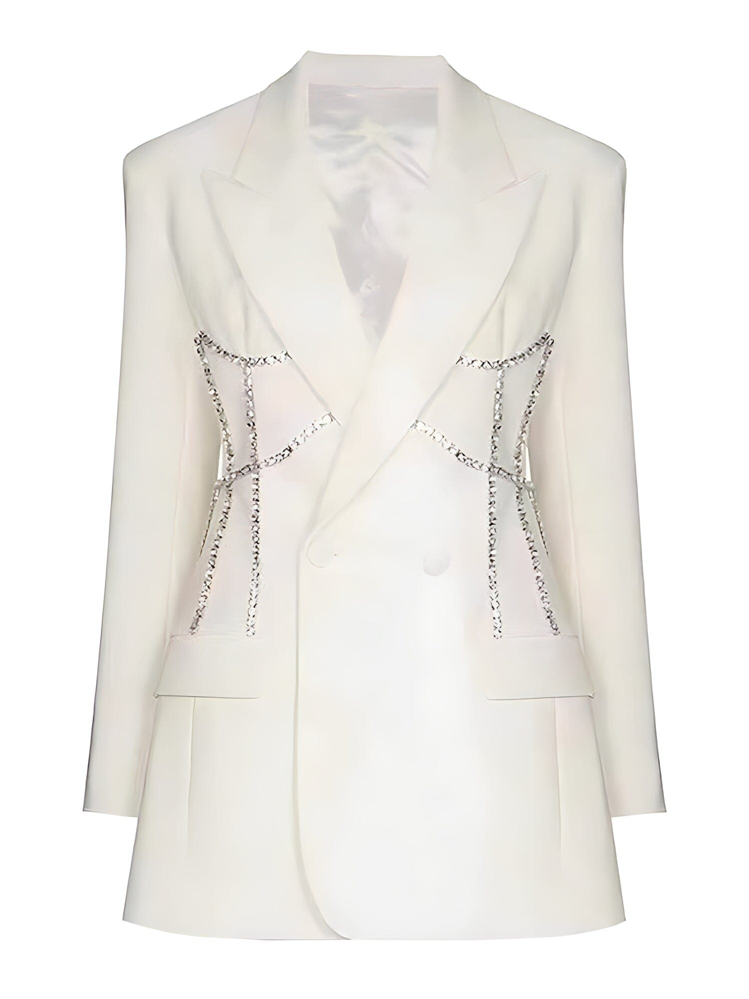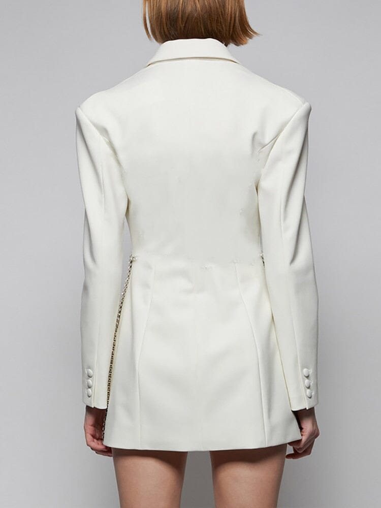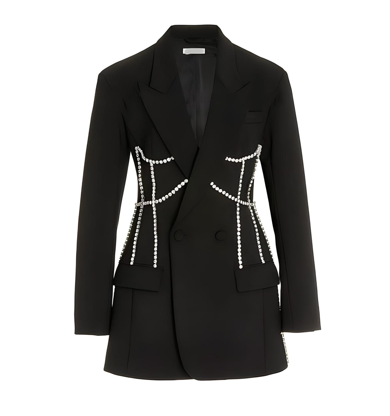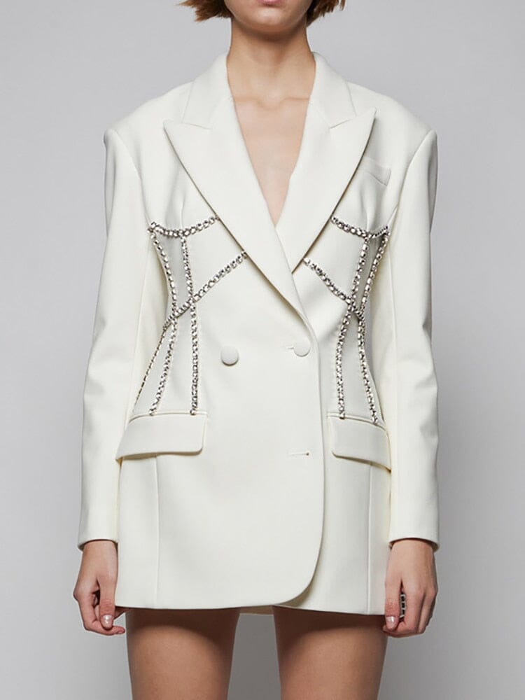 Intricate design and detailed handmade construction make the blazer an instant wardrobe essential. Featuring a premium polyester-cotton fabric blend, notched double-breasted lapel, and decorative rhinestone styling for a look you won’t find anywhere else. Perfect either as an oversized blazer or alluring mini-dress, you won’t want to leave home without this.